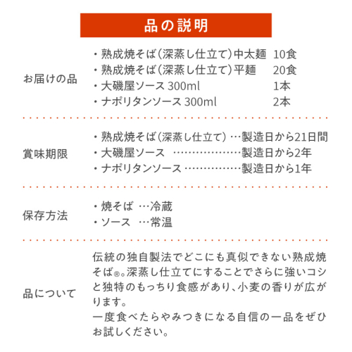 メディア紹介多数!大磯屋製麺所の熟成焼そば(深蒸し仕立て) 30食(中太麺&平麺) 特製ソース1本・ナポリタンソース2本付き H014-030