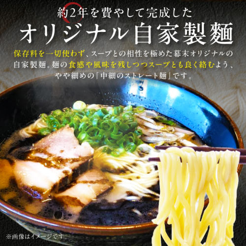 豚骨、鶏がら、野菜などを合わせてじっくりと煮込み、一晩寝かせた熟成スープは、コク、旨みはしっかりながらも、あっさりで後味も良い。 バラ肉で作った、とろける旨味の自家製チャーシューはやわらかくてボリュームたっぷり。 マー油とはニンニクと野菜を焦がして出来るパンチのある香味油です。 5段階に焦がすことによって甘味と香ばしさの風味の両方がバランスよく際立ちます。 低加水中細麺で小麦が香る自家製麺(バリ硬麺など、茹でる時間を変えて自分好みの硬さで) 豚骨スープ・麺・チャーシューの三位一体の【幕末のら~めん】を味わってください! お店そのままの味と風味をご家庭でもお楽しみいただけます。 【原材料】 麺(小麦粉、かん水、食塩、卵)、スープ(豚骨、鶏骨、野菜、醤油、砂糖、調味料(アミノ酸等))、 チャーシュー(豚肉、醤油、みりん、料理酒)、ネギ(原材料の一部に小麦を含む)甘味料(甘草)、 焦がしにんにく油(にんにく、玉葱、長ネギ、サラダ油、ゴマ油)(一部に大豆・ゴマ・小麦・卵を含む) 【保存方法】 −15℃以下で保存 【地場産品類型】 3 【類型該当理由】 御坊市内で製造、加工されたものであるため