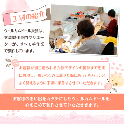 思い出の詰まったドレスをなかなか処分できず保管されてませんか?捨てられずにしまい込んだ大切な思い出が詰まったウエディングドレスを、お気に入りのぬいぐるみサイズなどにリメイクして、ずっと身近に置いておくことができます。一目見て一瞬で思い出が蘇るように、1着1着バランスよく心をこめてリメイクいたします。実際に着用されたウエディング衣装をお送り頂き、その生地を使って、ご希望のぬいぐるみサイズ、ハンガーサイズなどにリメイクいたします。高い技術を持った職人が1着1着心をこめて、ドレスに詰まった思い出が「カタチ」になるようにリメイクします。