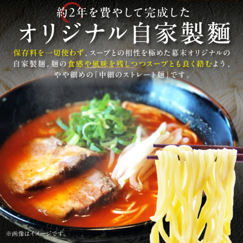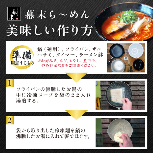 豚骨、鶏がら、野菜などを合わせてじっくりと煮込み、一晩寝かせた熟成スープは、コク、旨みはしっかりながらも、あっさりで後味も良い。 バラ肉で作った、とろける旨味の自家製チャーシューはやわらかくてボリュームたっぷり。 辛いだけではなく、唐辛子の旨味と香りが絶妙に合う甘口唐辛子を使用しています。 唐辛子には、胃腸の働きを活発にしたりストレス緩和、体脂肪の燃焼効果もあります! 低加水中細麺で小麦が香る自家製麺(バリ硬麺など、茹でる時間を変えて自分好みの硬さで) 豚骨スープ・麺・チャーシューの三位一体の【幕末のら~めん】を味わってください! お店そのままの味と風味をご家庭でもお楽しみいただけます。 【原材料】 麺(小麦粉、かん水、食塩、卵)、スープ(豚骨、鶏骨、野菜、醤油、砂糖、調味料(アミノ酸等))、 チャーシュー(豚肉、醤油、みりん、料理酒)、ネギ(原材料の一部に小麦を含む)、甘味料(甘草)、唐辛子粉末 (一部に大豆・ゴマ・小麦・卵を含む) 【保存方法】 15℃以下で保存 【地場産品類型】 3 【類型該当理由】 御坊市内で製造、加工されたものであるため
