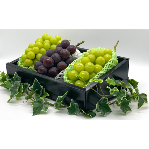 「シャインマスカットとピオーネ」ぶどうの人気な組み合わせです。大ぶりな芳香漂うシャインマスカット2房と紫ぶどうならではの濃い味わいのピオーネ。