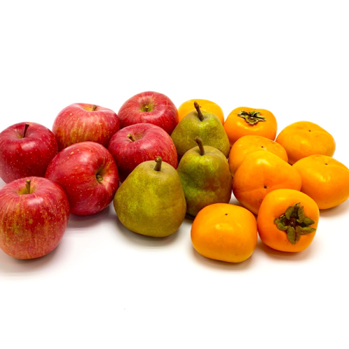 「りんご、ラ・フランス、柿」彩り豊かな3品種の詰合せです。