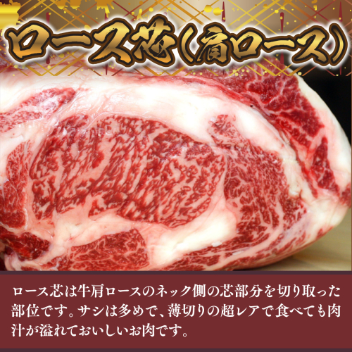 ロース芯は牛肩ロースのネック側の芯部分を切り取った部位です。サシは多めで、薄切りの超レアで食べても肉汁が溢れておいしいお肉です。