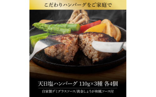 CDM017 食べ比べ!天日塩ハンバーグ3種セット各4個(110g×3種) 合計12個 ハンバーグ 黒毛和牛 美鮮豚 天然塩 天日塩 デミグラスソース 和風ソース ソース付き 牛肉 豚肉 温めるだけ 冷凍 配送 国産 故郷納税