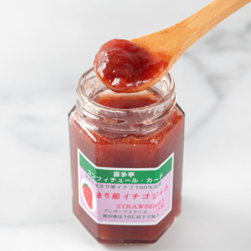 まり姫イチゴジャムは、和歌山県が作ったまり姫イチゴだけを使用、プレザーブスタイル(果実が残っているスタイル)のジャムです。
