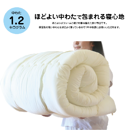 昨今の日本の気候を考慮して1年を通して快適な眠りを実現し、季節に応じた使い分けが出来るようにポリエステル100%、綿1.2kgの軽めの布団を作りました。