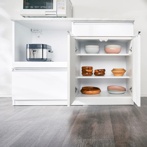 収納力も引き出しが2杯と開き戸収納、スライドカウンターがあり、充実の収納力を備えています。