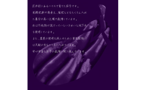 芸西村にあるハウスで育てた茄子です。有機肥料や腐葉土、堆肥などをたくさん入れた養分の高い土壌で栽培しています。水は不純物が混ざっていないきれいな地下水を使用しています。また、農薬の使用を減らすために害虫駆除には天敵の虫をハウスに入れています。安心安全な茄子の栽培に取り組んでいます。