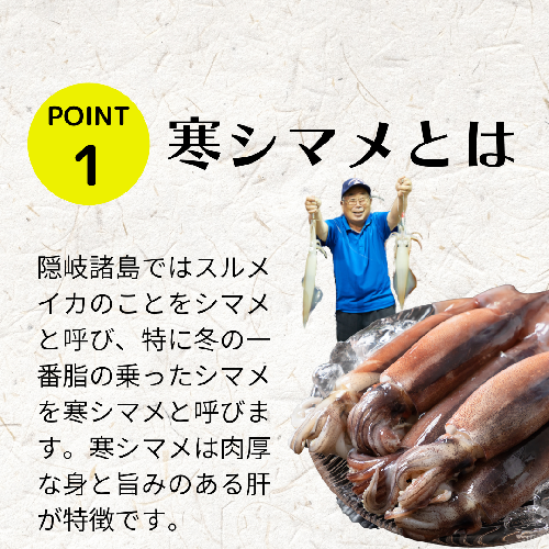 スルメイカのことを隠岐諸島では「シマメ」と呼び、特に美味しい冬の時期のスルメイカを「寒シマメ」と呼んでいます。