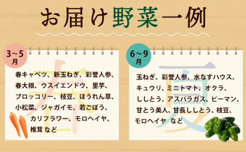 春キャベツ、新玉ねぎ、彩誉人参、春大根、ウスイエンドウ、里芋、ブロッコリー、ほうれん草、小松菜、ジャガイモ、椎茸、若ごぼう、カリフラワー、モロヘイヤ、枝豆