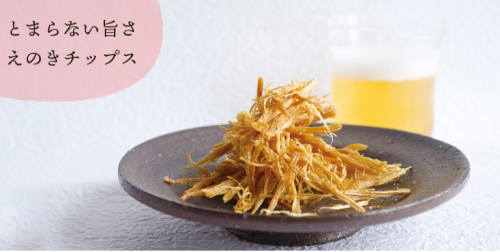 えのきチップスは旨味と栄養素が凝縮された乾燥えのきを使用しており、酸化しにくい油や本土最南端で手作りされている「こだわりの塩:楽塩」を使用することで、乾燥えのきの香ばしい風味や香りを活かした美味しいおつまみです。