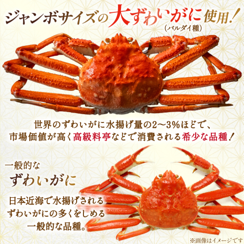 本品は姿の状態だと約830g~1,200gのジャンボサイズの大ずわいがに(バルダイ種)を使用。