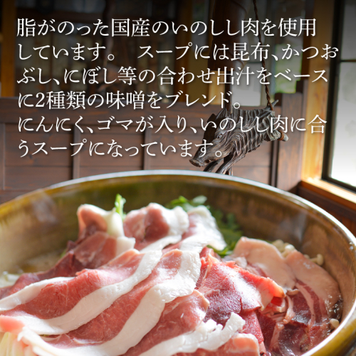創業50年以上になるいろり茶屋の人気商品、いのしし鍋のセットです。 脂がのった国産のいのしし肉を使用しています。 スープには昆布、かつおぶし、にぼし等の合わせ出汁をベースに2種類の味噌をブレンド。 にんにく、ゴマが入り、いのしし肉に合うスープになっています。 自家製ゆずこしょうをつけることで、より一層美味しく召し上がっていただけます。