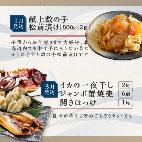 【3月】イカの一夜干し1袋2尾入り、開きほっけ1尾約500g、ジャンボ蟹焼売6個入り×1
