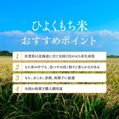 もち米の中でも、多くの和菓子御用達の佐賀県産ヒヨクモチは粘りが強く、炊いても硬くなりにくく、モチモチ感も抜群でお餅にはもちろん、おこわやお赤飯にも大変適したもち米です。