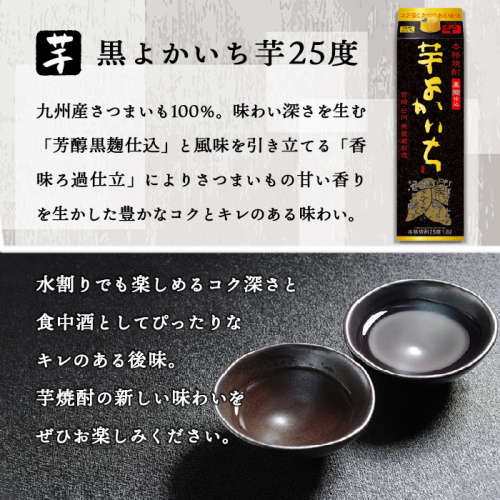黒よかいち芋の芋は産地100%。芋の甘い香りを生かした豊かなコクとキレのある味わいです。 ------------- 原材料名 さつまいも(九州産)、米麹(タイ産米) 保存方法 常温 ギフト対応 ※のし等のギフト対応をしておりません。ご了承ください。 備考 ※未成年者への酒類の販売は固くお断りしています。 町内工場で造られた熟成酒を使用しています。 ※未成年者への酒類の販売は固くお断りしています。 ------------- 【地場産品に該当する理由】 返礼品の主要部分をしめる甲類焼酎。原酒は全て区域内(宝酒造の工場「黒壁蔵」)で製造しているため。(告示第5条第2号に該当)