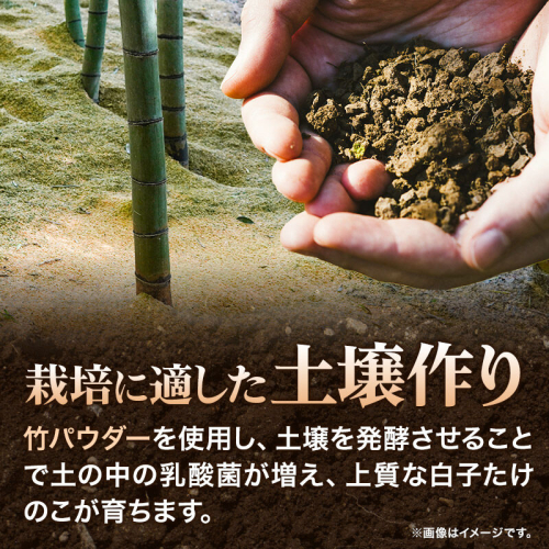 竹パウダーを使用し、土壌を発酵させることで土の中の乳酸菌が増え、上質な白子たけのこが育ちます。