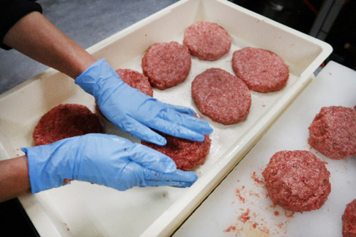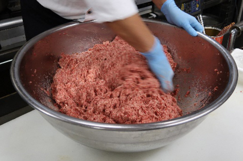 塊肉から筋引きして挽き肉、味付けハンバーグにしています。