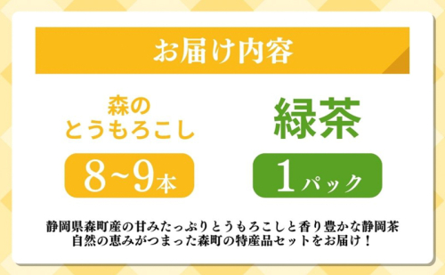 行列必須の森のとうもろこしと爽やかな風味の新茶のセット、森町の魅力が詰まった内容です。