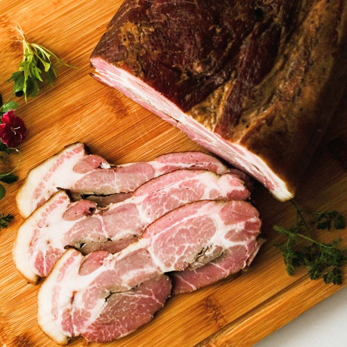「米粉」「おから」「ゆず果皮」を配合した餌で育った高知県産“ゆず豚”。または、四万十町、無手無冠さんの栗焼酎「ダバダ火振」の焼酎粕を食べて育った四万十ダバダ火振栗豚で作ったベーコンです。