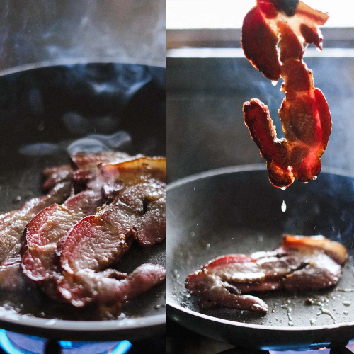 肩ロース肉をじっくり塩漬けしたあと、乾燥させて、日高村の桜の木と備長炭で10時間かけて燻しています。中心部まで加熱処理してあるので、そのまま召し上がっても。スライスしたベーコンをフライパンで加熱すれば、ご自宅でも本格的なカリカリベーコンが楽しめます! 目玉焼きと一緒に朝食。