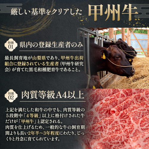 甲州牛の肉質は非常に柔らかく、肉の色合いは鮮やかで、独特の風味があります。口に入れた瞬間に広がる豊かな味わいと、溶けるような食感は、和牛ならではの魅力です。