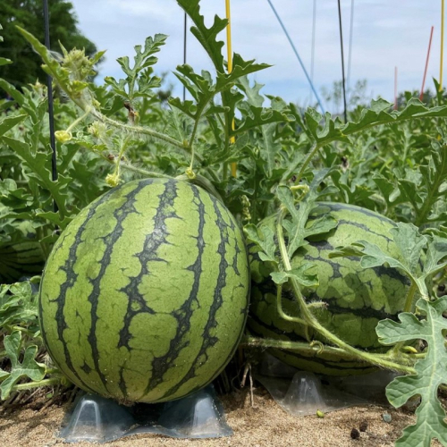 また、砂丘地で栽培されているため、水捌けの良く、果実に甘みが凝縮されます。甘くてシャリ感を楽しめる丹後スイカを皆様にお届けします。