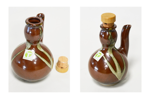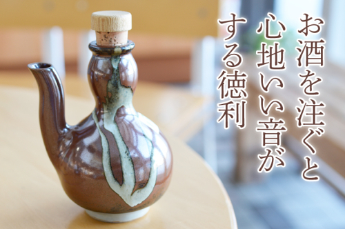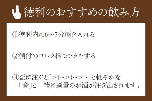 使用は、徳利内に6~7分酒を入れ、備付のコルク栓でフタをし、盃に注ぐと「コト・コト・コト」と軽やかな「音」と一緒に適量のお酒が注ぎ出されます。
