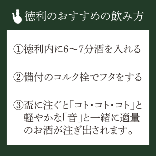 使用は、徳利内に6~7分酒を入れ、備付のコルク栓でフタをし、盃に注ぐと「コト・コト・コト」と軽やかな「音」と一緒に適量のお酒が注ぎ出されます。