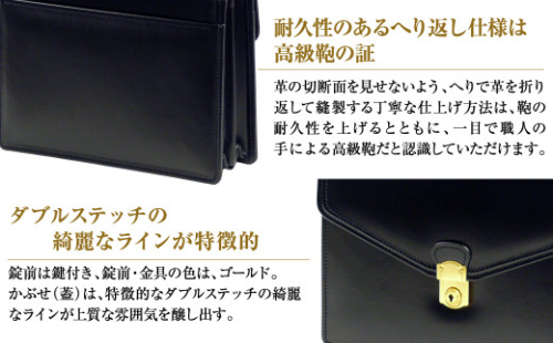 革の裁断の切断面を見せないように、鞄のへりで革を折り返して縫製するへり返し仕上げの美しい革鞄です。この丁寧な仕上げ方法は、耐久性にも優れています。中に仕切りが1枚付いているのでマチの形状がアコーディオンタイプとなり、机の上に立てても倒れず、自立するタイプの革鞄です。