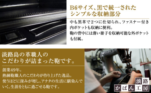 【商品仕様】一本手/底マチ・横マチ(2段)/中仕切り兼用ファスナー付き内ポケット(1)/B6内ポケット(後1)/B6外ポケット(後1)/2連カード入れ/ペン差し(3本)/錠前(鍵1本)