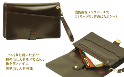 【個性的なメンズセカンドポーチ】 機能的な2つ折りタイプのハンドストラップ付きポーチです。2つ折りを開いた形で物の出し入れをするため、物を落とさずに簡単出し入れ可能 で、最近の牛本革製セカンドポーチとしては珍しい、個性的なメンズポーチです。