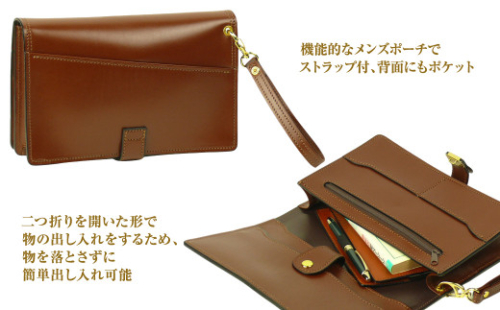 【個性的なメンズセカンドポーチ】 機能的な2つ折りタイプのハンドストラップ付きポーチです。2つ折りを開いた形で物の出し入れをするため、物を落とさずに簡単出し入れ可能 で、最近の牛本革製セカンドポーチとしては珍しい、個性的なメンズポーチです。