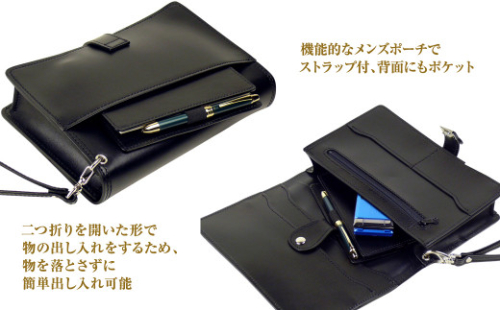 【フォマール仕様のメンズセカンドポーチ】 機能的な2つ折りタイプのハンドストラップ付きポーチです。2つ折りを開いた形で物の出し入れをするため、物を落とさずに簡単出し入れ可能 です。金具はシルバー(銀色)標準装備のフォーマル仕様です。