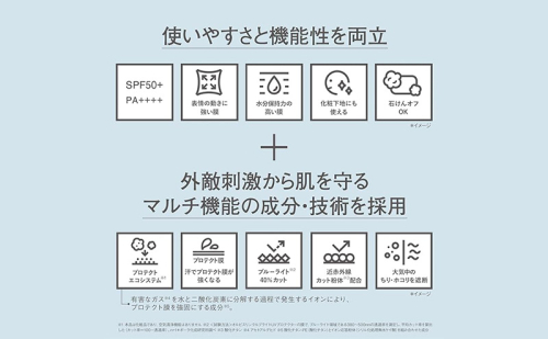 ■様々な外敵から肌を守る マルチ機能の成分・技術採用 ・汗や表情の動きに強く、水分保持力の高い膜 ・大気中のちり・ホコリを遮断 ・ブルーライト40%カット*5 ・近赤外線*6カット粉体配合 ・プロテクトエコシステム*7成分配合