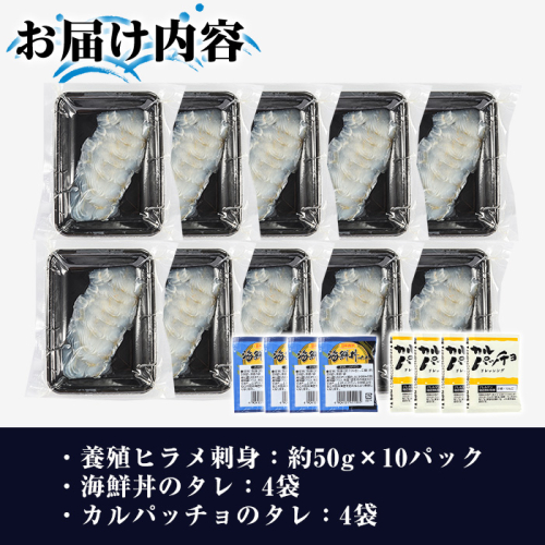 • <先行予約受付中!2025年12月中旬以降順次発送予定>阿久根産 養殖ヒラメ刺身(約50g×10パック)国産 養殖 ヒラメ ひらめ 魚 カルパッチョ 海鮮丼 調味タレ【寺地義明商店】akn074-02