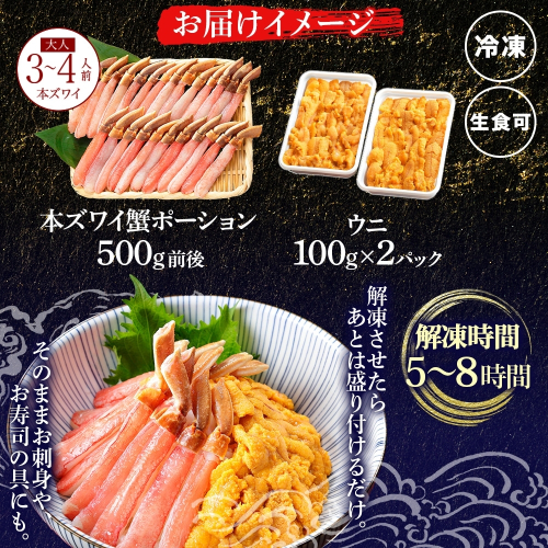 3396. 2種 海鮮丼 セット 3-4人前 カニ 蟹 かに ズワイガニ ポーション 500g前後 &ウニ チリ産 冷凍 うに 200g 送料無料 北海道 弟子屈町