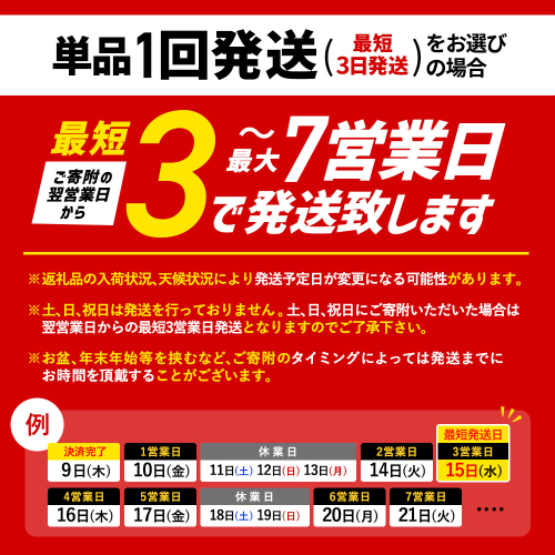 ※土、日、祝日は発送を行っておりません。土、日、祝日にご寄附頂いた場合は、翌営業日からの最短3営業日発送となりますのでご了承ください。