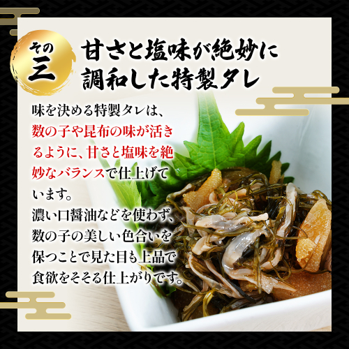 数の子の歯ごたえがしっかりしていて、パリッパリッと弾ける数の子が主役の松前漬けをお楽しみください。