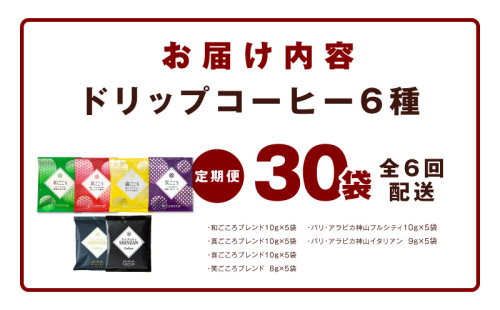 - ドリップコーヒー 6種30袋 定期便 全6回【毎月配送コース 珈琲 こーひー コーヒー 自家焙煎 オリジナル ギフト キャンプ アウトドア 家計応援】 099Z145