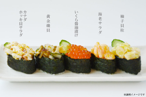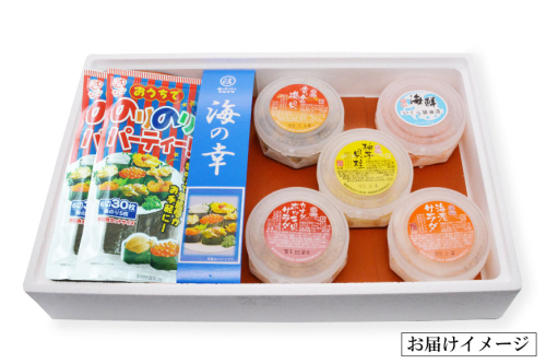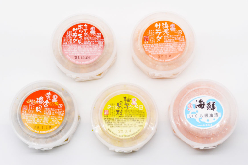 具材は、素材の風味を生かした人気のある商品をタップリと5種類(いくら醤漬・(珍味) 黄金磯貝・カナダホッキ貝サラダ・海老サラダ・柚子貝柱)詰め合わせました。