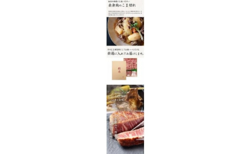 シャトーブリアンのステーキ肉と赤身肉のこま切れをセットにし、贈答用としてもお使いいただける折箱に入れてお届けします。