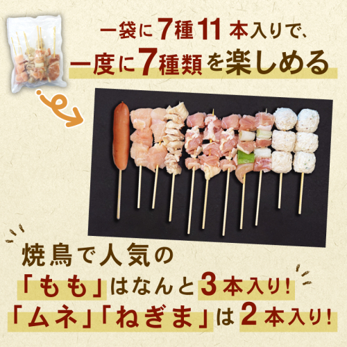モモ3本、ももネギま2本、皮1本、ウインナー1本、ムネ2本、つくね1本、ニラつくね1本:1袋(計11本)×8袋