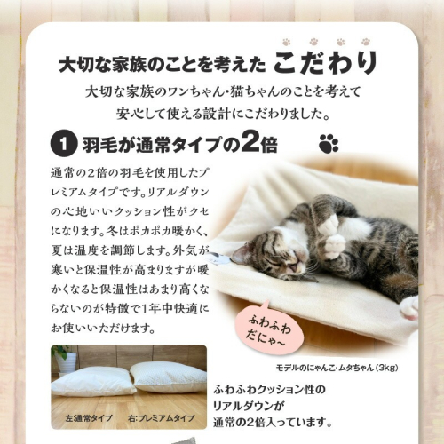 リアルダウンの心地いいクッション性がクセになります。羽毛はなんとも言えないクッション性と冬はポカポカ暖かく、夏は温度を調節します。外気が寒いと保温性が高まりますが暖かくなると保温性はあまり高くならないのが特徴で1年中快適にお使いいただけます。