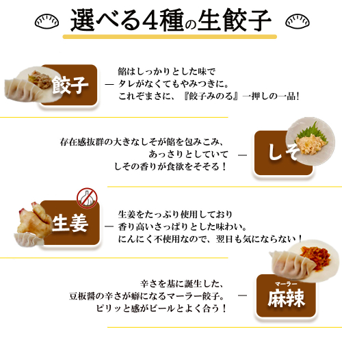 試行錯誤の末に完成した「餃子 みのる」の手づくり餃子です。ベースとなる餃子60個入り1パックとお好きな餃子30個入り1パック(ADから1種類をお選びいただけます)の合計90個をセットでお届けします。