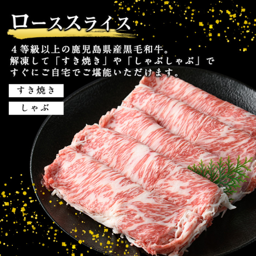 4等級以上の鹿児島県産黒毛和牛をローススライスで。この機会に是非、畜産王国、鹿児島の和牛をご自宅でご堪能下さい。 【ご寄附前に必ずご確認ください】 到着後は速やかに返礼品の状態をご確認ください。 万全を期して返礼品をお届けしていますが、万が一、不備等があった場合は返礼品到着から2日以内に、写真(画像)を添付のうえ、電子メールにてお問合せ先までご連絡ください。 日数が経ったものに関しましては対応いたしかねます。 ご了承の上、お申込みくださいますようお願い申し上げます。
