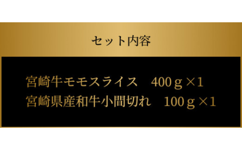 赤身が強く肉の味がしっかりと味わえるあっさりとした宮崎牛モモスライス400gと、いろいろなお料理に便利な宮崎県産和牛小間切れ100gのセットです。