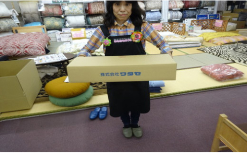 近江の麻は鎌倉時代から続く伝統産業で側生地も中綿も近江本麻100%。本品の中綿は、麻の中でも吸放湿性の高いラミー麻を長さ75ミリの長繊維にカットして縮れ加工を施したので、ふんわりと弾力性があり、埃が立ちにくいのです。