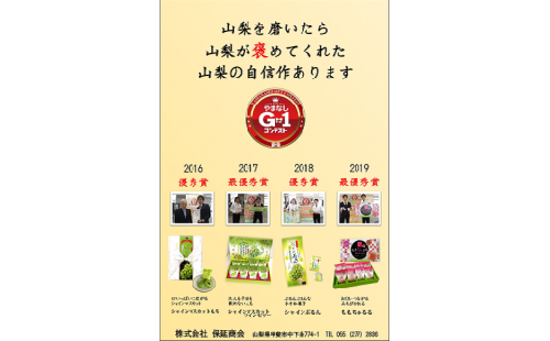 山梨の土産品総選挙である「やまなしG1コンテスト」の受賞商品をセットにしました。 2016優秀賞  シャインマスカット餅        シャインマスカットのお餅の中にシャインマスカット餡とチョコレートを入れました。食べた瞬間口の中にシャインマスカットが広がります。 2017最優秀賞 シャインマスカットワインゼリー        シャインマスカットワインを使用した、色・香り・味を楽しむちょっと大人のワインゼリーです。お子様でも安心して召し上がれます。 2018優秀賞  シャインぷるん        ぷるんぷるんなゼリーの中にシャインマスカット餡をとじこめました。みずみずしくてもっちもちな新触感ネオ和菓子です。 2019最優秀賞 ももちゅるる        桃ピューレを使用したなめらか生地に桃のプチゼリーをトッピング。桃の甘みと酸味をちゅるっと食べるスイーツです。       事業者:株式会社保延商会     〒400‐0124 甲斐市中下条774‐1     TEL 055-277-2836 ★★甲斐市ふるさと応援寄附金公式インスタグラム☆☆ https://www.instagram.com/kaicityfurusatotax/ ぜひフォローお願いします!!