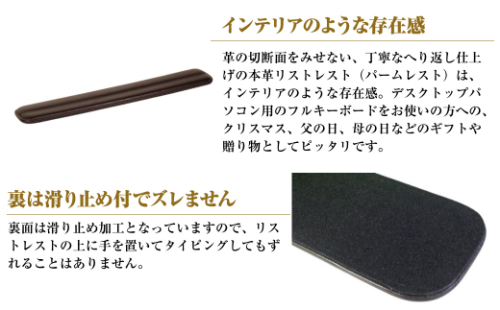 パソコングッズではなく、インテリア小物としての雰囲気も漂います。裏面は滑り止め加工となっていますので、リストレストの上に手を置いてタイピングしてもずれることはありません。是非、この本革リストレストを使って、一味違ったパソコンライフをお楽しみください。
